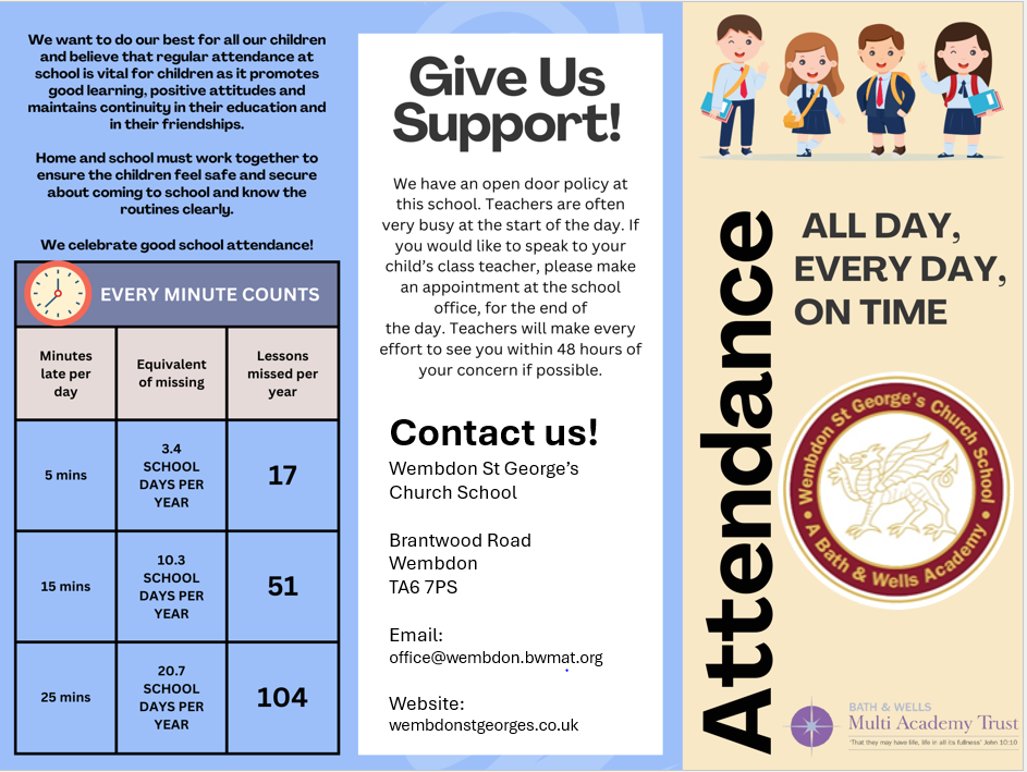 It is vital that children develop regular attendance habits at an early age, therefore Wembdon St George Church School will encourage parents of Nursery children, and Reception children who are not yet of compulsory school age, to send their children to every session available to them. If the child is unable to attend for any reason, the parents should inform the school/nursery in the same way as with children of compulsory school age. Information specific to nursery children is in section 10 below.